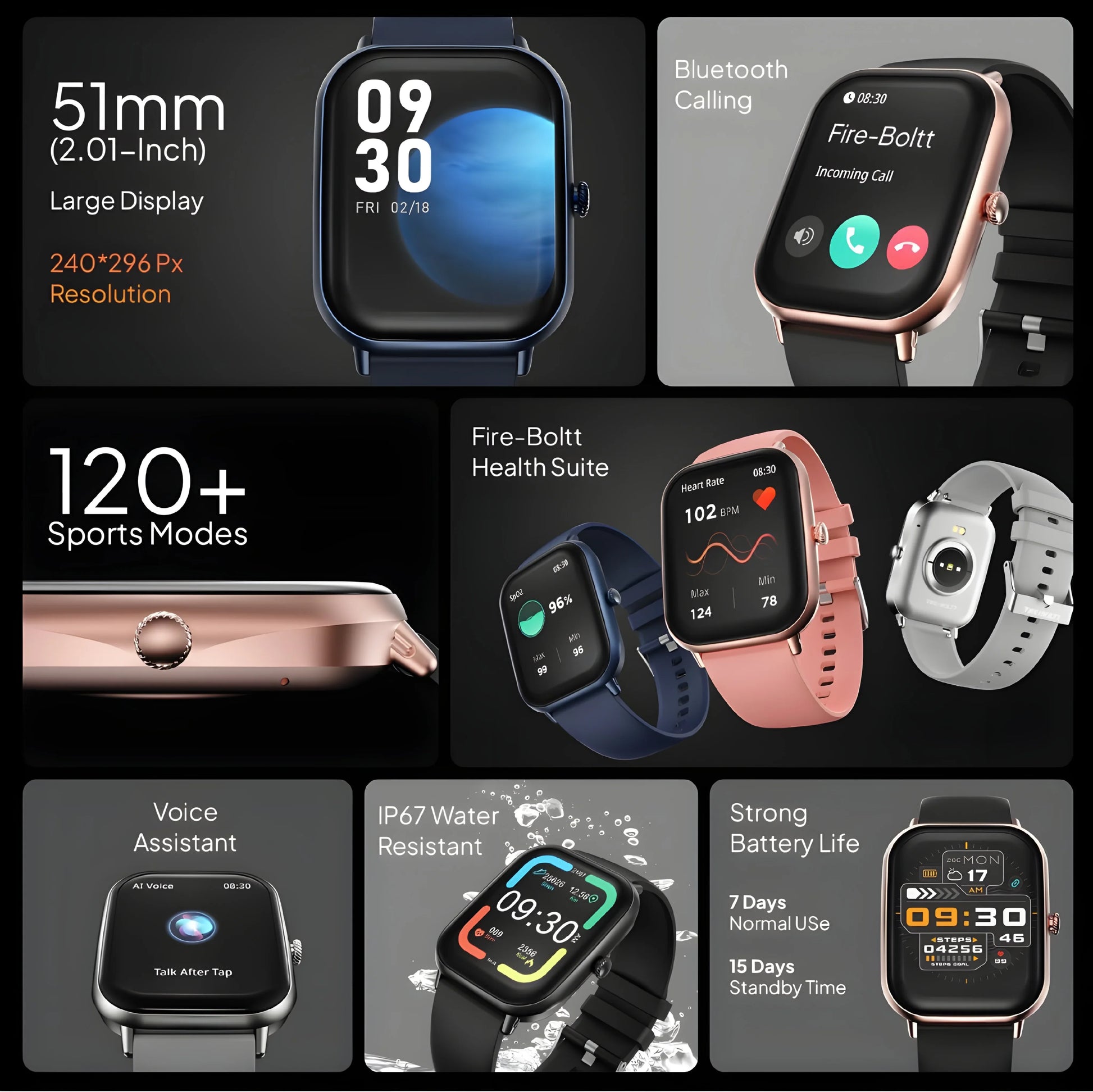 Special Feature 2.01" Display, Bluetooth Calling Voice Assistance, 120+ Sports Mode Tracking, In Built Mic & Speaker etc.