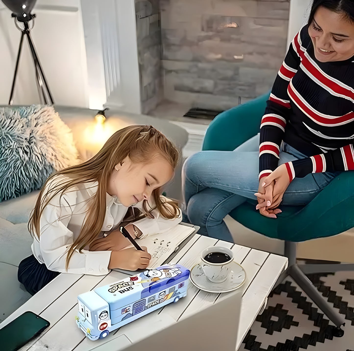 Beautiful Bus Shape Pencil Box (Blue) School Bus Metal Geometry Box for Kids Magic Bus with Moving Tyres with 3 Compartments Moving Tyres and Sharpener Geometry Case for Boys and Girls (Blue)